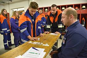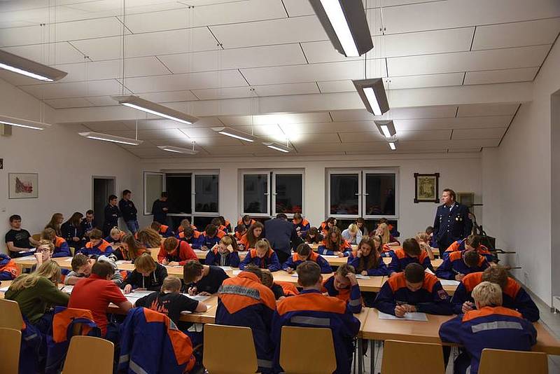 Diesjähriges Thema war Unfallverhütung, Persönliche Schutzsausrüstung und Dienstkleidung in der Jugendfeuerwehr. Zur Prüfung traten insgesamt 125 Jugendliche aus insgesamt 22 Jugendfeuerwehren des Dienstbezirks 3 zur Prüfung an. Kreisbrandinspektor Peter Schlerf und Kreisbrandmeister Christian Falk begrüßten die Jugendlichen und teilten kurz zur Prüfung ein: ein Teil der Prüflinge ging in den Unterrichtsraum um dort die theoretische Prüfung abzulegen, während sich der zweite Teil der praktischen Prüfung stellte. In der Prüfung galt es zwischen 10 und 30 Fragen, je nach abzulegender Stufe, richtig zu beantworten. Im praktischen Teil gab es drei verschiedene Aufgaben: an der Station 1 musste die Schutzausrüstung eines Feuerwehranwärters zwischen dem 12. – 16. Lebensjahr und dem 16. – 18. Lebensjahr richtig zugewiesen werden. An der Station 2 wurde der Feuerwehrjugend jeweils zwei Bilder gezeigt. Auf den Bildern ging es um das Thema Unfallverhütung. Dabei gab es jeweils ein Foto, was aufzeigte, wie man es richtig ausführt und eines, wie es falsch ist. Die Jugendlichen mussten das richtige Foto herausfinden und auch eine Bewertung vornehmen, warum sie sich für das entsprechende Foto entschieden haben. An der 3. Station mussten dann diverse veränderliche oder feste Funktionsabzeichen einer Funktion zugeordnet werden.