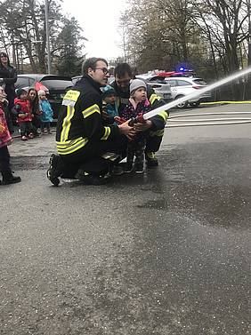 Die Feuerwehr wartete bereits am Feuerwehrhaus auf ihren Einsatz, als Frau Reinfelder den internen Feueralarm auslöste. Um auch für die Feuerwehr den Einsatz anspruchsvoll zu gestalten, musste eine „verletzte“ Erzieherin im Personalraum gefunden und gerettet werden. Das verbleibende Personal evakuierte zügig die gesamten Kinder. In dieser Zeit rückte auch schon die Feuerwehr an, um einmal die Evakuierung miterleben zu können. Nach einem kurzen Sammeln vor dem Gebäude, bei dem überprüft wurde, ob alle Kinder und Erwachsenen evakuiert werden konnten und die Feuerwehr hierüber informiert wurde, machten sich alle auf den Weg in das AWO – Seniorenheim. Dort wurden alle bereits von Frau Jenner im Speisesaal erwartet. Hierfür wurden im Vorfeld auch extra Getränke für die Kinder besorgt, damit diese während der Wartezeit gut versorgt waren. Währenddessen übte die Feuerwehr in der Einrichtung die Rettung der vermissten Erzieherin mit Einsatz der Atemschutzausrüstung. Für die Feuerwehr ist dies eine gute Gelegenheit, die Gegebenheiten für den Ernstfall bestens kennen zu lernen. Nach der Übung durften alle Kinder zurückkehren und sich ihre Schuhe und Jacken anziehen, denn im Anschluss durften die Kinder noch genau das Feuerwehrauto inspizieren. Maik Heyden bedankte sich im Namen der Feuerwehr für eine reibungslose Übung. Auch die Leiterin Frau Reinfelder bedankte sich bei der Feuerwehr und der Leiterin des AWO – Seniorenheimes für die tolle Unterstützung bei dieser Übung. Für die Feuerwehrleute gab es zum Abschluss noch eine Stärkung! Gerd Reither von der Gaststätte „Zum Ludwigskanal“ in Schwarzenbach spendierte für alle Bratwurstsemmeln! Vielen Dank allen Beteiligten, die diese Brandschutzübung möglich gemacht haben.