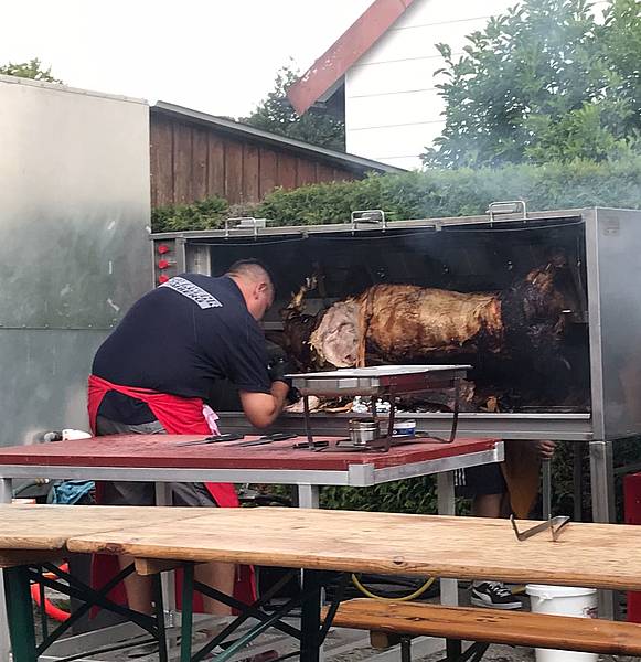 Bei angenehmen Temperaturen fand bereits am Freitag der erste Teil des Aufbaus statt, ehe am Samstag dann die Pavillons und die Zeltgarnituren aufgebaut wurden. Die Sau grillte währenddessen bereits seit 6:00 Uhr am Drehspieß.