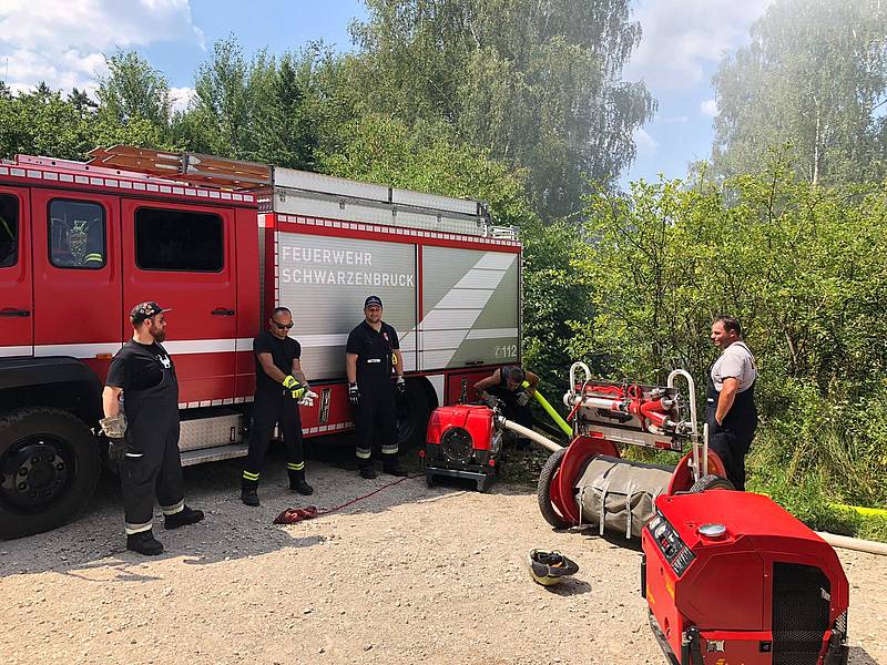 Der gesamte Ausbildungsinhalt verteilte sich - in Anlehnung an den Musterlehrplan zur Ausbildung der Freiwilligen Feuerwehren in Bayern (FwDV2) - über 8 Theorie- und Praxistermine. Das erlernte Wissen mussten dann alle 18 Teilnehmer bei der Abschlussprüfung, dem Aufbau einer 1,2 km langen Schlauchleitung und der anschließenden Wasserförderung aus der Schwarzach im Burgthanner Unterdorf bis nach Westhaid, unter Beweis stellen. Diese bestanden die Teilnehmer, unter den Augen der Ausbilder und dem zur Prüfung anwesenden KBI Christian Falk und "KBM Ausbilder" Philipp Wolshöfer, ohne Probleme. Auch der Bürgermeister der Gemeinde Burgthann, Herr Heinz Meyer, machte sich vor Ort ein Bild über die Ausbildung und drückte den Prüflingen die Daumen zum Gelingen.